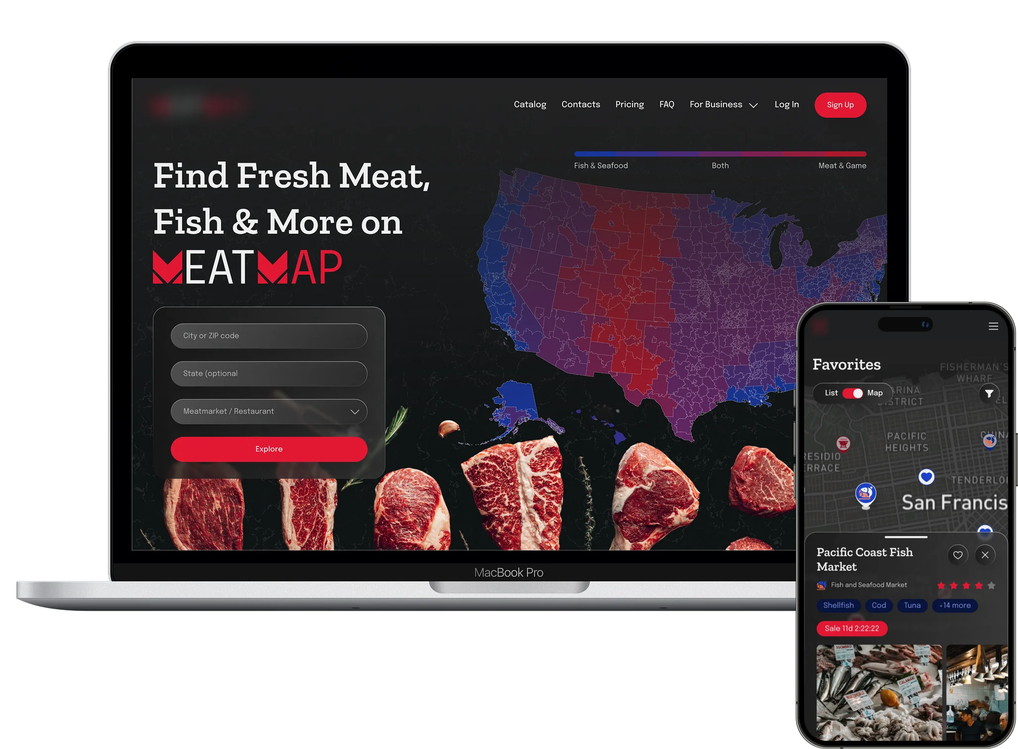 MeatMap is a clean, mobile-friendly directory website designed to connect users with local meat and seafood markets, steakhouses, and BBQ restaurants.